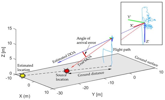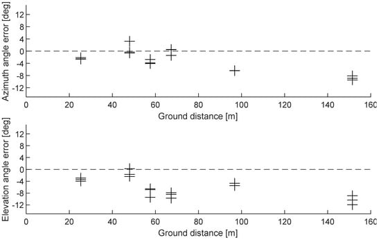 The estimated angle of arrival at the time an acoustic source was detected and the position and posture data of the drone could be corrected to specify the source location on the ground. Figure 15 shows the results of determining the estimated accuracy of the acoustic sources above the ground by the error of the horizontal and vertical angles. In this graph, the angle error of 0 degrees implies the true direction for the actual position based on GPS localization, and the measurement error represents the directional error angle that occurred from the true direction. In this experiment, acoustic source detection was performed up to a maximum ground distance of 151.5 m. The mean estimation error for three repeated impact sounds confirmed the detection performance of 8.8 degrees for the horizontal angle error and 10.3 degrees for the vertical angle error (Table 2). The estimated direction error for the entire location tended to increase both horizontally and vertically as the ground distance increased; the vertical angle error tended to be slightly higher than the horizontal angle error. The estimation error was the most sensitive during the drone’s positional information correction process. In other words, we experimentally confirm that the location and posture of the drone at the time of detecting an acoustic source of interest must be applied to enable accurate localization.