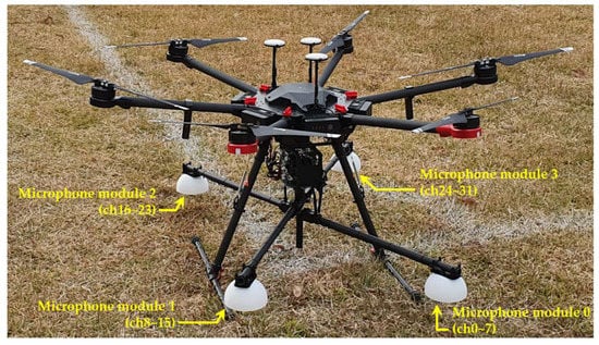 One way to cope with disasters and security situations is to use drones to search for where events occur [,], which can provide visual information by taking images from the sky. In general, drone imaging has been used for military purposes, and it is also the most commercially used method for video production. The usability of drones has already been demonstrated, and as the operating area gradually gets closer to humans, there is a demand for new detection methods beyond existing mission equipment that only provides images. One new method is to detect sounds.