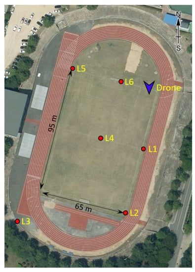 Experiments to verify the acoustic source localization performance were conducted in a stadium at Chungnam National University. The experimental environment is shown in Figure 7, indicating the locations of the acoustic sources, i.e., firecrackers, and where the drone was hovering in place. To quantify the locations of the sources, a line in the soccer stadium was referred to and the absolute location was measured using GPS. The Universal Transverse Mercator Coordinate System (UTM) using the WGS84 ellipsoid was used to derive plane coordinates based on the central position (Location 4) of the soccer stadium. The locations of the acoustic sources on this plane coordinate and the location of the drone are defined as absolute coordinates, and the results of estimating the location of the acoustic source based on the drone’s GPS information can also be expressed.