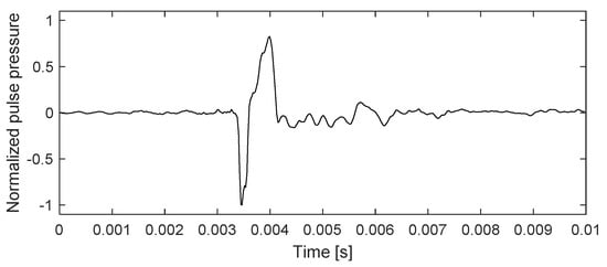 The acoustic sources used for the experiment were commercial firecrackers, which use gunpowder to generate short impulse signals after a certain period of time when ignited. The acoustic pressure signal from the explosion of the firecracker used in the experiment is shown in Figure 8. This signal was collected separately without a drone and measured at a distance of about 20 m away from the location of the firecracker near the center of Figure 6. That is, the signal was completely unrelated to the operation of the drone and was intended to observe pure acoustic signal features. Strong impulse signals, such as explosions, are easy to distinguish in domains because of their strong amplitude and clear features. In the practical problem of finding acoustic sources, impulses are only one example of the detection targets, but they are important underlying experiments in the goal of assessing the detection performance that this study wants to identify. Additionally, it is possible to identify whether spectral subtraction methods work well for a specific frequency or frequency band that wants to denoise. The impulse signal has the constant response characteristic across all frequencies. In order to restore the energy of pure impulse signals as much as possible in a state of noise mixing, it is important to subtract only a specific frequency for the noise to be removed. The impulse is one of the useful targets for providing basic clues to determine the acoustic frequency of the drone to be removed. It was confirmed that the explosion signal was characterized by a short and strong shock sound in an instant. The firecrackers were fixed just above the ground. The location estimation results analyzed in the Results section were performed for approximately 20 min during 1 sortie flight. The firecrackers were detonated three times at each point in the order of location numbers from L1 to L6. The interval between each three repeated explosions was about 10 s. A straight line from the hovering position to the detonating location is described in Table 1, up to 151.5 m. During this flight, the drone maintained a hovering position at an altitude of about 150 m. The drone’s position was near the right-hand corner north of the soccer stadium, heading southwards, and it maintained a stable hovering position due to the stabilizer mode.