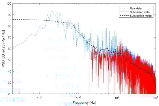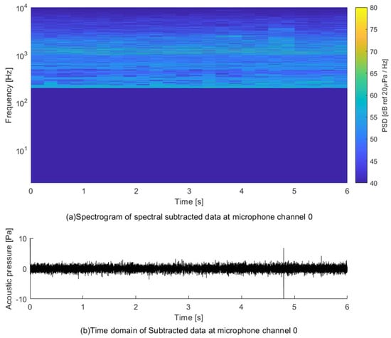 Figure 9 shows the acoustic pressure signals measured by the drone-mounted microphone system, in a hovering position. It is a spectrum that averages acoustic pressure signals measured over 3 s using a total of 32 microphones. The frequency decomposition was 1 Hz, and a 5 Hz high pass filter was applied. This spectrum is meaningful for identifying noise characteristics that actually operate underneath the drone. Noise can be observed together with atmospheric flow and background noise present in the atmosphere when the actual drone is maneuvering. In particular, it is a very poor measurement environment in which fluctuating pressure caused by the propellers’ wakes at the bottom of the drone directly affects the microphones. Analysis of the mean spectrum is the basis for determining the frequency bands and amplitude that are necessary to determine the noise generated by drones when flying, and that should be deducted when applying spectral subtraction.