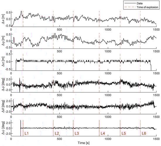 The direction of arrival of acoustic waves was estimated by dividing the maximum beam power into the azimuth and elevation angles based on the heading of the flying drone. The drone’s headings are related to the body coordinate system, and the roll, pitch, and yaw angle are output from the drone’s flight control system in the reference direction. The pose angle of the drone and the estimated arrival angle of the acoustic wave were corrected relative to the ground. Figure 14 shows the record of flight posture and positional data collected from the time of takeoff until the drone lands after the completion of the measurement and maintains hovering during experiments measuring the sound of the explosion. The flight data showed the amount of change based on the average value of the hovering time interval. The time data also showed when the first explosion was detected at each explosion location from Locations 1 to 6. The remaining firecrackers exploded sequentially, seconds apart after the first explosion.