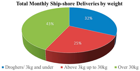According to the available data collected, the average monthly ship–shore deliveries comprised 32% Droghers (explained in Section 5) related deliveries 3 kg and under, 25% involved packages above 3 kilograms (kg) up to 30 kg, and 43% involved packages over 30 kg. Crew change operations were not taken into consideration within these figures. This information is represented in Figure 3.
