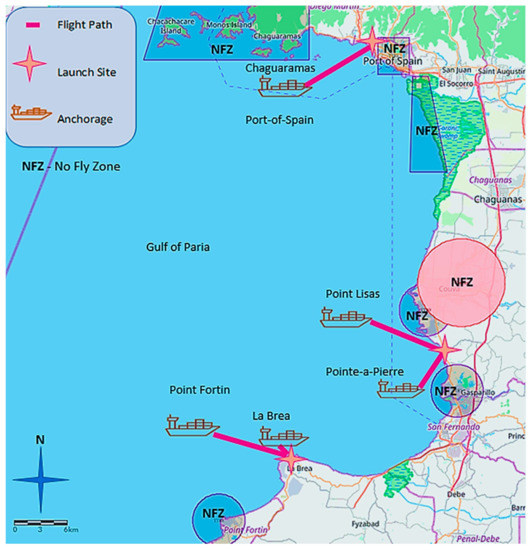 Theoretically, UASs have proven beneficial from an economic perspective and can decrease the traditional levels of human risk while reducing carbon footprint and air pollution [9,10,11]. Maritime drone deliveries are currently being utilized within the ports at Rotterdam and Singapore with great success [2]. However, it is essential to note that operational dynamics and each country’s unique legislative and governance structures are integral when implementing any new approach. This study assesses the potential use of a UAS ship–shore delivery service to optimize near harbor delivery operations within the crucial ports of Trinidad. The feasibility was determined by comparing the economic benefits, human risk factors, and environmental impact between the locally utilized launch boats and a proposed UAS. The local implementation and operational challenges were identified and analyzed. Additionally, remedial suggestions for these challenges are presented.