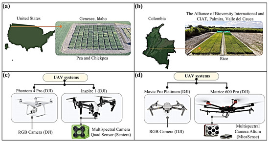 Locations and UAV sensor systems used in this study: (a,c) Genesee, Idaho; (b,d) Km 17 Recta Cali-Palmira, Colombia.