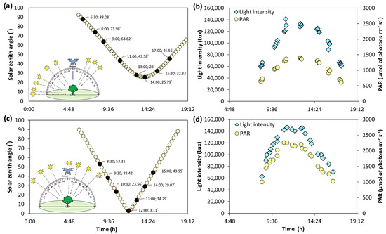 Images acquisition at different solar zenith angles and light conditions: (a,b) Genesee, Idaho; (c,d) Km 17 Recta Cali-Palmira, Colombia.