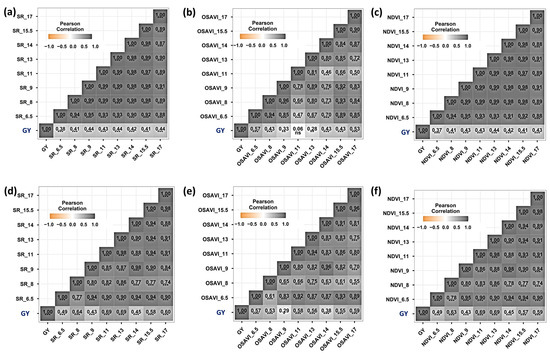 Pearson correlation coefficient between grain yield (GY) and simple ratio (SR), optimized soil-adjusted vegetation index (OSAVI), and normalized difference vegetation index (NDVI) across SZA [06:30 (88.08°), 08:00 (73.98°), 09:00 (63.82°), 11:00 (43.50°); 13:00 (28.00°), 14:00 (25.79°), and 15:30 (32.33°)]: (a–c) pea and (d–f) chickpea. Statistical significance: p > 0.05 (ns); p ≤ 0.05 (*); p ≤ 0.01 (**); p ≤ 0.001 (***); and Not significant (ns).