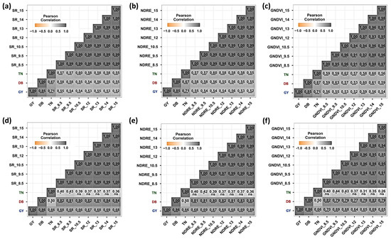 Pearson correlation coefficient between grain yield (GY) and simple ratio (SR), red-edge normalized difference vegetation index (NDRE) and green normalized difference vegetation index (GNDVI) across solar zenith angles [08:30 (53.31°), 09:30 (38.42°), 10:30 (23.56°), 12:00 (3.11°), 13:00 (14.29°), 14:00 (29.07°), and 15:00 (43.95°)]: (a–c) IR64 lines and (d–f) Ciherang lines. Statistical significance: p > 0.05 (ns); p ≤ 0.05 (*); p ≤ 0.01 (**); p ≤ 0.001 (***); and Not significant (ns).