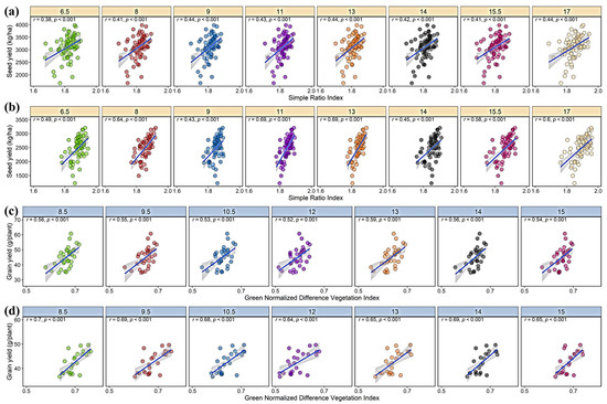 In pulse trials, Pearson’s correlation coefficients revealed that SR, OSAVI, and NDVI were statistically significant with seed yield showing some differences across SZA (Figure 3a–f). OSAVI showed low correlation (r = 0.33 and 0.28, respectively) at 09:00 (63.82°) and 13:00 (28.00°) and no significant correlation at 11:00 (43.58°) in pea. In both chickpea and pea trials, SR and NDVI displayed moderate to high significant correlations with GY (r = 0.43 to 0.69) at 11:00 and 13:00, which corresponds to 43.58° and 28.00° in the high latitude (Figure 3a,c,d,f).
