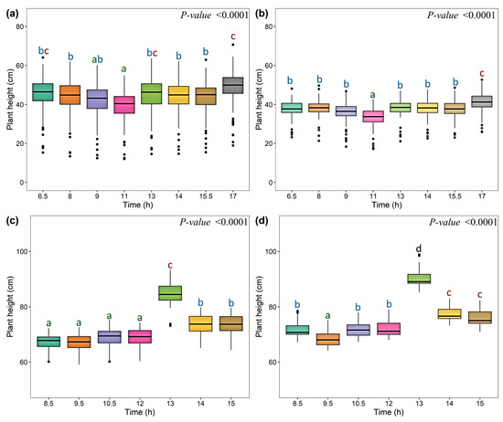 One-way ANOVA and post-hoc Tukey’s honest significant difference test comparing estimated plant height across the solar zenith angles: (a) pea; (b) chickpea, (c) IR64 (rice); and (d) Ciherang (rice) lines. The same letter indicates statistically non-significant differences between the mean values.