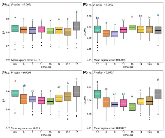 One-way ANOVA and post-hoc Tukey’s honest significant difference test comparing VI across the solar zenith angles: (a,b) pea; (c,d) chickpea. The same letter indicates statistically non-significant differences between the mean values of the corresponding VI.