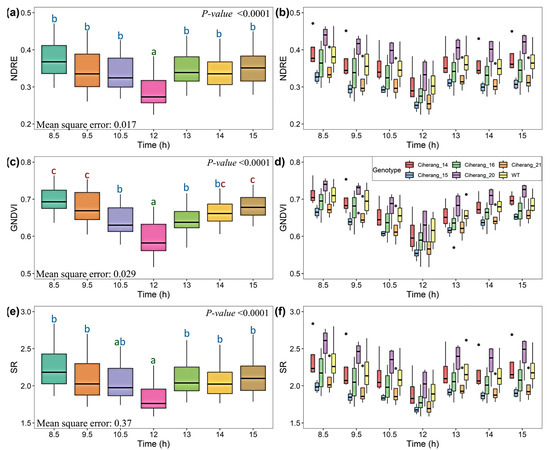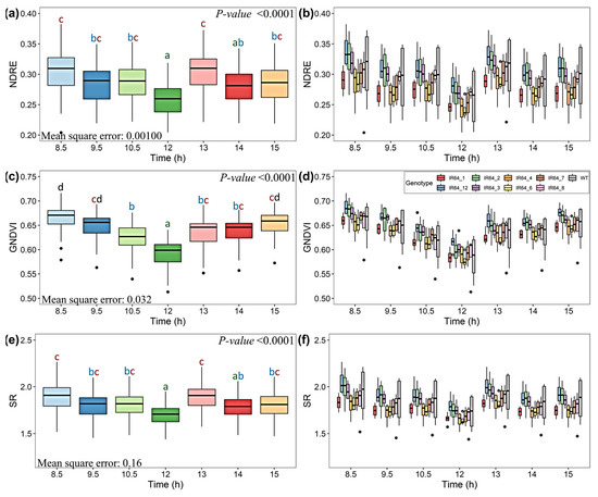 One-way ANOVA and post-hoc Tukey’s honest significant difference test comparing VI across the solar zenith angles in IR64 lines. The same letter indicates statistically non-significant differences between the mean values of the corresponding VI. (a,b) NDRE, (c,d) GNDVI, (e,f) SR.