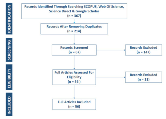 SCOPUS, Web of Science, and Science Direct were utilised to establish literature based on specified keywords. The literature search was framed based on the PRISMA statement (Table 1). Since the current work was adding to what has already been established, the literature search was not restricted to the above databases. We used Google Scholar to identify and include articles that SCOPUS, Web of Science, and Science Direct had not indexed. The search covered the period from 1980 to January 2021.