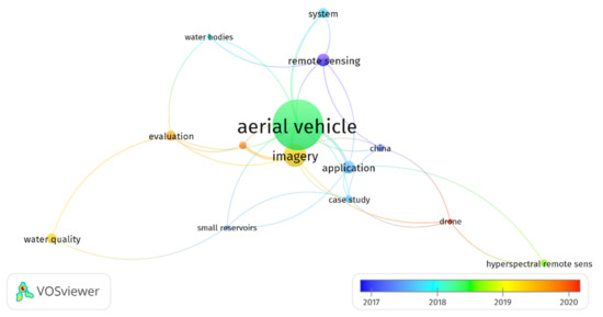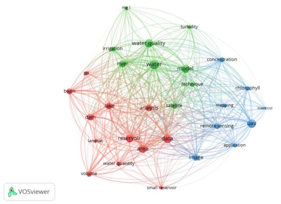 In evaluating the evolution and topical concepts of mapping and monitoring the quality and quantity of open water bodies, results showed that the utilisation of drone-based “remote sensing” “application” “case studies” trending mostly in “small reservoirs” of “China” around 2017 (Figure 2). The period from 2018 to 2020 represents an intensification in terms of the imagery analysis in the evaluation of water quality. This period was marked by the application of hyperspectral drone cameras in mapping water quality (Figure 2). Meanwhile, Figure 3 illustrates three topical clusters, green, blue, and red, in monitoring water. The key terms from the blue cluster were “UAV’, ‘remote sensing’, (‘image’), ‘application,’ ‘mapping’, ‘chlorophyll’, ‘concentration’, ‘low cost’, and ‘measurement’, which directly imply the utility of UAVs as a low-cost remote sensing system associated with mapping chlorophyll concentrations (Figure 3). The second-largest cluster linked to UAVs was in red and had ‘reservoir’, ‘lake’, ‘dam’, ‘basin’, ‘area’, ‘volume’, ‘area’, ‘data’, and Landsat. This articulates the major water quantity parameters, i.e., volume area, that were widely characterised using Landsat data and ‘GIS ‘techniques. The third cluster in green had ‘water quality’, ‘water’, ‘model’, ‘river’, ‘turbidity’, and ‘irrigation’ as the key terms in order of importance (Figure 3). This cluster presented the linkages between chlorophyll and turbidity concentrations which were previously modelled using satellite-borne data mainly in the context of evaluating the quality of crop irrigation water.