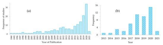 Frequency of studies that mapped surface water resources per year based on (a) both satellite and drone-borne sensors. (b) Drone-borne sensors.