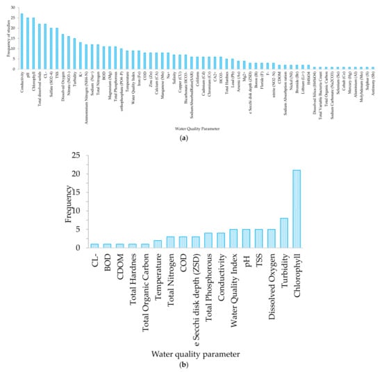 Generally, progress is noted in detecting, mapping, and monitoring surface water resources, using remotely sensed data (Figure 3). As in Gholizadeh, Melesse and Reddi [7], the results of this study illustrated that most of the studies that utilised earth observation data sought to characterise water quality more than water quantity (Figure 3). The widely researched water quality parameters included conductivity [24,25], pH [25,26], Cl− [24], dissolved oxygen [27], total suspended solids (TSS) [28,29], chlorophyll [30,31,32,33], turbidity [34,35,36], K+, ammonium nitrogen (NH4-N), sodium (Na+), BOD, magnesium (Mg), total phosphorous, orthophosphate (PO4–P), temperature and total nitrogen, iron (Fe), COD, zinc (Zn), calcium (Ca), manganese (Mn), salinity, copper (Cu), bicarbonate HCO3−, sodium-absorbed ratio (SAR), coliform, cadmium (Cd), chromium (Cr), CA2+, HCO3−, and total hardness in order of frequency, as illustrated in Figure 4b. These parameters were mostly characterised using satellite remotely sensed data.