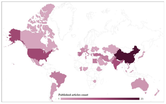 In terms of the spatial distribution, the majority of studies that have hitherto ventured into the utility of drones in mapping water quality parameters such as chlorophyll, turbidity, DO, TSS, and pH were mostly conducted in China, the USA, Latin America, Europe, and Australia (Figure 6). This could be attributed to the fact that the earliest drone technologies began in Europe, the USA, and China between 1849 and 1916. Since then, the technology has been spreading. However, very few studies have been conducted in the global south, especially in Africa. Subsequently, there is a need to consider and prioritise water quality parameters such as chlorophyll, turbidity, DO, TSS, and pH when devising irrigation water quality assessment techniques, especially in the global south.