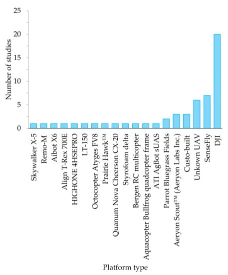 Satellite platforms of freely available datasets such as Sentinel 2 and Landsat tend to be limited by cloud cover and relatively coarser spatial and temporal resolutions, which are difficult to implement at farm scales. The findings of this study also illustrated that 77% of the studies in mapping surface water resources using drones were conducted based on the multi-copter platform systems, and 23% were based on fixed-wing platforms (Table 1). Interestingly, innovative octocopters and hovercrafts have also been harnessed for this particular purpose [25,44]. The dominance of the multi-copter platforms in water resources mapping could be because they are relatively cheaper than fixed-wing platforms [45,46]. Specifically, in their comparative study, Brito et al. (2019) noted that the superiority of the multirotor platforms was established better in the context of two-dimensional mapping surfaces, as is the case with mapping agricultural fields and surface water resources. Above all, the multi-copter platforms were associated with a capability for vertical take-off and landing (VTOL). Most of the DJI multi-copters can VTOL [46]. This makes it easy to utilise multi-copter drones in any environment. However, batteries are their major setback [46]. The weight of multi-copter drone batteries and their capacity limits their flight duration significantly. Specifically, 35% of the studies noted in this study utilised the DJI multi-copter series from the Chinese company, Shenzhen DJI Sciences and Technologies Ltd (Figure 7). This was the most widely used platform based on the findings of this study. Generally, the DJI Matrice and the Phantom series were the dominant DJI platforms noted in our study. This could be attributed to the fact that the DJI Matrice platforms seem to be compatible platforms that can be integrated with many types of sensors, as illustrated in Table 2, when compared to other platforms.