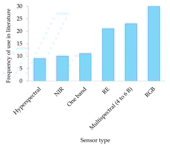 The advent of drone technologies has seen the utility of sensors, such as Nikon (NIKKOR AF-S 24–85 mm f/3.5–4.5G ED VR) and the Nikon D800 [47], GoPro Hero 4 Black Edition [48], Feiyu Mini 3D Pro [48], Sony [44], and CMOS [49] to the multispectral sensors such as the MicaSense, Parrot Sequoia [28,50,51,52,53,54,55] Sentera [38], MicaSense RedEdge multispectral [29,56], and the hyperspectral sensors such as Headwall Photonics Inc (207 bands), Ocean Optics STS-VIS (640 bands) [27], AvaSpec-dual Gaia (640 bands) [35,57], Sky-mini Nano-Hyperspec [30], Canon EOS 5DS R, and Headwall Nano-Hyperspec (640 bands) for local-scale water remote sensing applications (Table 2). However, as the spectral resolution of drone sensors increases, the associated costs also increase linearly. From our results, it can be observed that the most widely used sensors were the Cannon, Sony, MicaSense, and the Nikon.