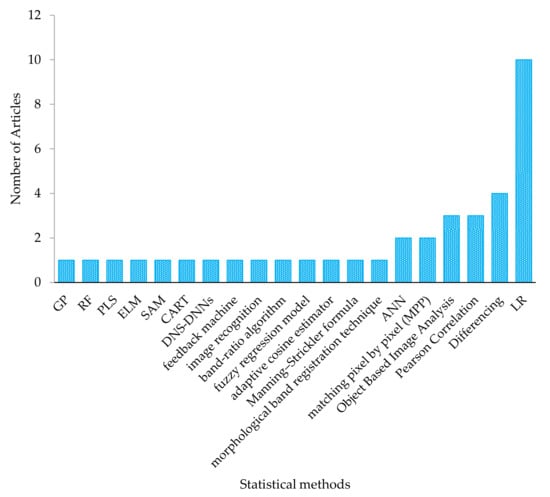 Numerous vegetation indices were derived from drone remotely sensed data for characterising surface water quality and quantity. The most widely used sections of the electromagnetic spectrum in detecting water quality parameters were the visible section (blue and green) and the NIR wavebands. In this regard, vegetation indices such as the red and near-infrared (NIR), Surface Algal Bloom Index (SABI) [60], two-band algorithm (2BDA) [26], NDVI, and Green NDV [33], as well as band combinations and differencing such as (R+NIR/G) were used mostly in characterising chlorophyll content as well as TSS. As was suggested in many studies, the combination of sensitive spectral variables with robust and efficient algorithms produce accurate models. This study noted that algorithms such as linear regression (LR), image differencing, matching pixel-by-pixel (mpp), artificial neural networks (ANN), and the Manning–Strickler and adaptive cosine estimator were utilised in characterising mostly water quality parameters (Figure 9). The mpp based algorithms were also detected during the bibliometric analysis illustrated in Figure 3 (red cluster). Despite being a parametric estimator, LR was the most widely used algorithm because it is simple to implement [61] across various statistical platforms ranging from Microsoft Excel to R statistics. Since LR is a parametric statistic, it requires the data to suit specific assumptions such as normality that are often a challenge to attain. In this regard, there is a need for more efforts in assessing the utility of robust machine learning algorithms such as stochastic gradient boosting, random forest, and the ANN in mapping water quality based on drone remotely sensed data (Figure 10).