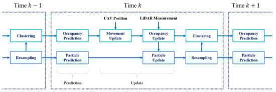 As shown in Figure 1, the overall process proceeds in the order of prediction, update, resampling and clustering. The prediction step predicts the movement of close objects based on the LDM of previous time step, time in Figure 1. This process is divided into occupancy prediction, which predicts the occupancy grid map state and particle prediction, which predicts the particle state. After that, the update step, which reflects the current flying environment information of the UAV, is performed. It is divided into three steps: Movement update, occupancy update and particle update. The movement update step updates the grid map region of LDM by using the current position of the UAV. This step removes the area away from the LDM due to the movement of the UAV and initializes the area that is newly close to the UAV. Occupancy update is the process of reflecting distance sensor measurements such as LiDAR mounted on the UAV to the 3D voxel grid map of the LDM. This process can determine whether each voxel in the LDM is currently occupied by objects. The particle update step is the process of updating the particle state using the voxel grid map in the LDM. Each particle’s weight is updated using the occupancy probability of the voxel in which each particle is located. This is a process to get a difference in the reliability of the position and velocity information of each particle. After that, the resampling step adjusts the overall number of particles based on weight. The clustering process generates object clusters by using occupancy probability to provide object-level representation. In the next time segment, time in Figure 1, the prediction and update steps are performed recursively by using object clusters and particle states of . In this section, the prediction, update, resampling and clustering steps are described in detail.