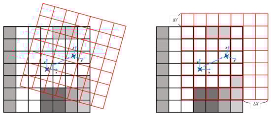 An example of the update process of the grid map in the proposed LDM. For visualization, we reduce the dimension to 2D. On the left is the example of the overlap situation when the update grid map region depends on UAV position and orientation. The right image is the update process used in our LDM. If the UAV located voxel moves as shown in the right image, the grid map region also moves . LDM prevents overlap issues by using this updated process.