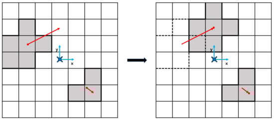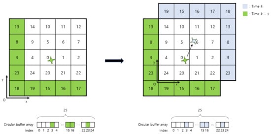 with means grid voxel where the UAV located at time k relative to grid voxel coordinate at time and means the offset voxel at time k. In this process, voxels that move out of the grid map region are cleaned and voxels that are included newly to the grid map region are initialized. To do this simply and fast, circular buffer indexes of the moved out voxels are allocated to newly entered voxels and initialized to log-odds notation of unknown probability, as shown in Figure 4. Through this, the grid map update according to the movement of the UAV can be performed with high speed.
