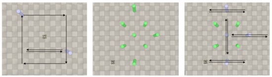 We implement the hardware and software system for outdoor UAV to evaluate the proposed LDM algorithm. as shown in Figure 10. As the body frame, Matrice 100, which includes GPS, IMU and flight controller, is used. Ouster 16-channel 3D LiDAR is used as a sensor to recognize the flying environment. Jetson TX2 board is used to acquire sensor data and run the algorithm and an extra battery is additionally installed to operate the board. The proposed LDM algorithm implementation is the same as the simulation’s one. The evaluation is conducted in two scenarios. Scenario 1 is a scenario consisting of two moving people and one stationary person and scenario 2 is a situation where the UAV and the person move in the same direction as shown in Figure 11.