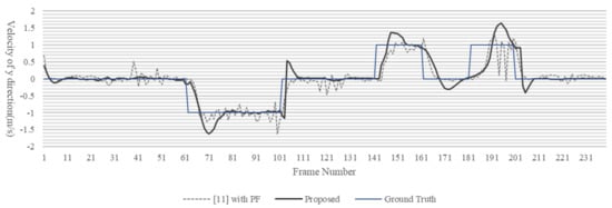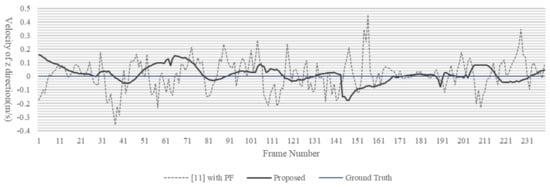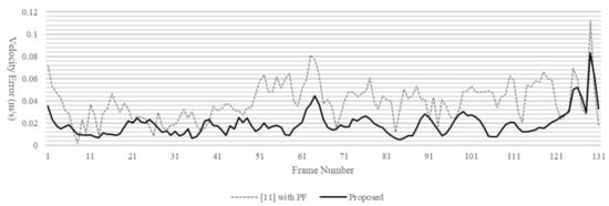 Figure 6 shows the absolute value of the estimated velocity error of a static obstacle. The velocity estimation of the proposed algorithm is more accurate for static obstacles in almost all times compared to [] with PF. The average velocity error of the proposed algorithm is m/s, while [] with PF showed an average velocity error of m/s.