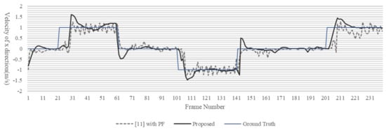 Figure 7, Figure 8 and Figure 9 show the result of velocity estimation of a dynamic obstacle. The measured obstacle moved only the x and y directions. The time for the estimated velocity to reach the ground truth velocity of the dynamic obstacle is similar between the proposed LDM and [] with PF. However, in the case of [] with PF, the estimated velocity is not constant, whereas in the case of the proposed LDM, the estimated velocity is almost similar to the ground truth velocity and is estimated at a constant. The average velocity error of the proposed LDM is m/s, while [] with PF shows m/s average velocity error.