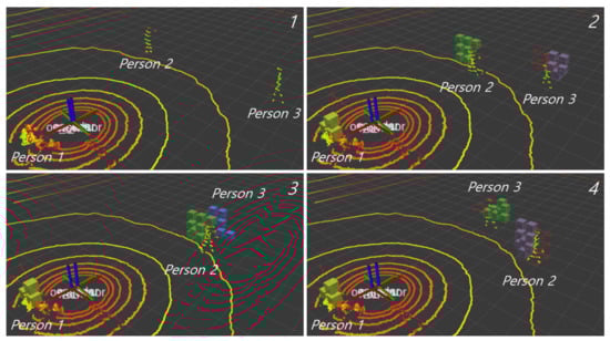 The results of the proposed LDM are shown in Figure 12 and Figure 13. In Figure 12, for the experiment, we created an environment with one static obstacle (Person1) and two dynamic obstacles (Person2 and Person3). Among the dynamic obstacles, Person2 moves to Person3 ( direction) and Person3 moves to Person2 ( direction). When each reaches the other’s starting position, they come back to their own starting position. Interference of Person3 by Person2 occurs in image 3 in Figure 12, but the cluster is not lost because of occupancy prediction. It can be seen that the velocity direction is estimated according to the moving direction of the dynamic objects.