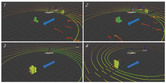 Figure 13 shows another scenario testing the proposed LDM and its results. In this scenario, the UAV and an obstacle are moving in the same direction always. In images 1–3 of Figure 13, the UAV is moved to the direction and the obstacle is also moved in the same direction. In image 4 of Figure 13, the UAV is moved to the direction and the obstacle is also moved. We can see that the direction of the obstacle and the direction of the estimated velocity of the obstacle are the same.