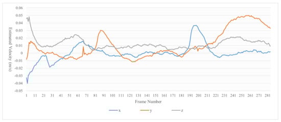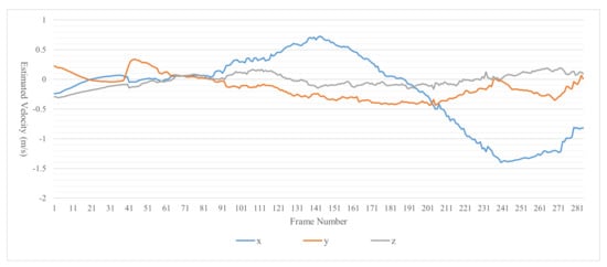 Figure 14, Figure 15 and Figure 16 show the velocity, estimated by the proposed LDM, of obstacles in the scenario of Figure 12. Figure 14 is the estimated velocity of the static obstacle (Person1). The proposed LDM shows an error of up to 0.05 m/s in all directions for the estimated velocity of a static obstacle. Figure 15 represents the estimated velocity of Person2 and Figure 16 represents the estimated velocity of Person3. From 91 to 181 frames, when Person2 moves in the direction, we can see that Person3 moves in the direction. It can also be seen that after frame 181, these peoples return to their starting points.