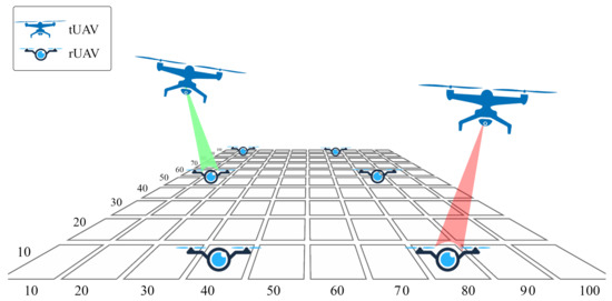 In our scenarios, we consider six rUAVs and two tUAVs, located in an environment modeled as a 100 × 100 grid (Figure 2). To simplify our simulation design, we assume all rUAVs can be located only at the center of cells as illustrated in Figure 2. Each tUAV sends the recharging beam toward the target rUAV that is selected by the algorithm. We selected an arbitrary frequency of 25–27 GHz which can be adjusted as per the spectrum regulations in the region. Note that increasing the frequency increases free space path loss but more antennae can be installed in the same antenna size since the MIMO proper inter-element space is related to wavelength. For example, the wavelength of frequencies below 1 GHz is very large for MIMO. Additionally, 1–7 GHz is highly saturated for current wireless communications [40]. On the other hand, high path loss in higher frequency is helpful to minimize the interference of WPT to ground stations. Hence, we propose mmWave spectrum for our conjecture. We assume a maximum power of 1 Watt is transmitted at each sub-band of 10 MHz width. This is reasonable in terms of regulations as in most countries mobile devices that work in the millimeter-wave spectrum are permitted to operate in 83 dBm /100 MHz range [23]. There are 256 antenna elements installed on each tUAV and rUAV in a uniform square array, and since the EM wavelength is about 1.2 cm , the array can be readily fitted on a small drone. For a square array, the number of antenna elements should be a power of 2, e.g., 256. All simulation parameters are defined in Table 1.