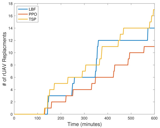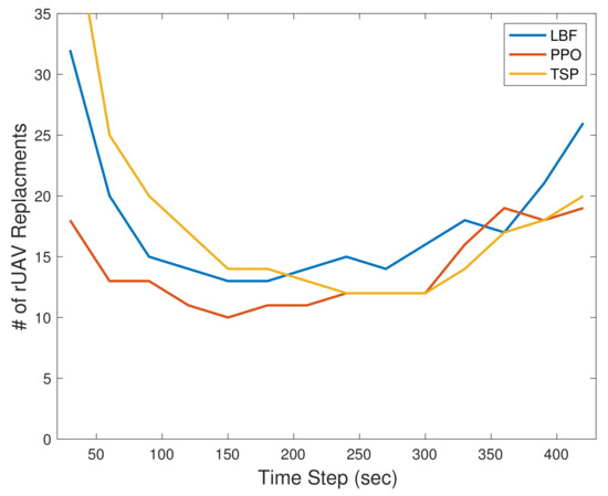 Second, since the tUAV’s recharging ability is not used when it is traveling, increasing the time step may improve the results for benchmarks. For this purpose, we simulated the scenario with different time step durations to compare different models’ performances. The result is plotted in Figure 4. As can be seen, the PPO’s performance can also be improved for longer time steps of about 150–200 s. It is further observed that TSP can be as good as PPO for some time steps. However, the figure shows that the PPO performance superiority is maintained for all time step values despite the fact that the gap is reduced in 150–200 s. To conclude, the best overall performance is recorded for a time step of 150 s by PPO when only 10 replacements are recorded over 10 h.