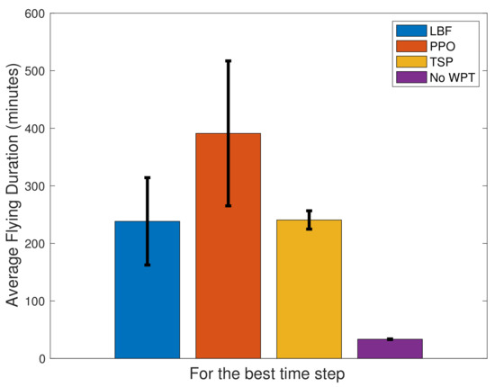 Furthermore, we have recorded the flight duration of all rUAVs in our simulation. Figure 5 demonstrates their average flying times. We have used the best time step for each scheme based on Figure 4. As is shown, while it is only 33 min without employing the WPT recharging mechanism, the proposed PPO based WPT can increase rUAVs’ flight duration up to 390 min for the studied scenario. Moreover, it can be observed that the low complexity schemes of LBF and TSP can achieve an approximately 240 min flying duration, which is significant. This result demonstrates the merit of our proposed MIMO-WPT based UAVs recharging architecture, irrespective of the specific movement strategy of the tUAVs. However, the PPO’s performance achieved notable gains of about 60% higher than the benchmark movement schemes. Additionally, a confidence interval of 95% is shown in Figure 5 that shows energy distribution fairness among rUAVs. Among the three schemes of WPT, TSP is distributing energy more equally.