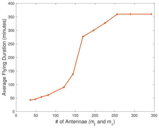 On the other hand, we present the average flight duration of rUAVs in Figure 6 for different numbers of antennas in which we consider the same value for m r and m t . Clearly, increasing the number of antenna elements can increase the beamforming gain and improve the WPT efficiency. However, this is limited by the total transmitting power, and the WPT’s efficiency (RF-RF) which cannot be more than 100%. Note that we assumed a maximum of 90% RF-RF efficiency to address the non-ideal implementation factors such as mutual impedance between antenna elements in the antenna array [43].