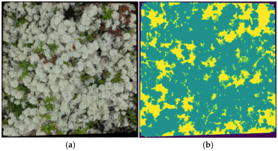 In addition to the 86 ground photographs, corresponding prediction masks from the eCognition Digital Photo Classifier (DPC), as outlined by Lovitt et al., were used to create percent lichen ground cover masks (Figure 1) [26]. The DPC masks included three classes: lichen, not lichen, and border. We manually corrected for misclassifications within the masks using GIMP image editing software, and considered the adjusted output to be the true masks for the ground photographs. The ground photo mask pairs were used in the training of the UAV LiCNN.