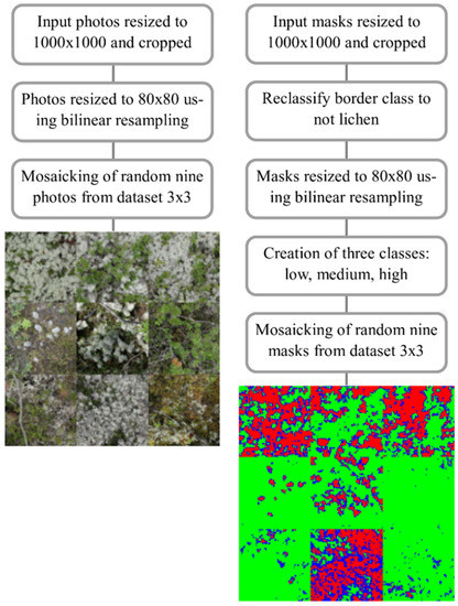 Creation of the training mosaics. Ground photographs were resized, cropped, and resized to 80 × 80 px before being stitched into mosaics. Input masks were resized, cropped, and resized to 80 × 80 px before being separated into three classes. The reclassified masks, with red as high lichen, blue as medium lichen, and green as none to low lichen, were then stitched into mosaics representative of the respective ground photo mosaics.