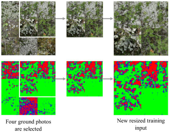 After preparing the training data, the datasets were loaded into a Tensorflow 2.4.1 environment. Similar data augmentations that were completed in the creation of the validation and test datasets were applied to the training datasets as the image composites were loaded. Leveraging random cropping data augmentations, the UAV LiCNN randomly crops training inputs to four ground photographs in a training mosaic and resizes them back 240 × 240 px (Figure 3). This process simulated a resolution of approximately 1.5 cm in our training data. Combining the cropping and resize outputs with the original training mosaics increased the robustness of the UAV LiCNN, yielding better segmentation results.