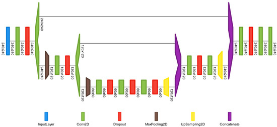 We selected a modified U-Net model as the basis for our neural network after testing other CNN models and U-Net. These models struggled with training, resulting in output masks with all pixels classified as none to low lichen, or outputs with inaccurate results. We realized that potentially the blank mask outputs with the U-Net could have been caused by the amount of down-sampling from multiple max pooling functions. The UAV LiCNN addressed these concerns, as it is a shallower neural network than U-Net, having only two max pooling functions instead of four and less convolutional layers. Figure 4 is a graphical representation of the UAV LiCNN architecture, created using a visual grammar tool [33]. The UAV LiCNN had an input shape of 240 × 240 px with three channels. The final convolutional layer used a ‘sigmoid’ activation function, while all other convolutional layers used ‘relu’ activation functions. The dropout layers in the model were set to 0.3 to prevent model overfitting. The UAV LiCNN model (Supplementary Materials) used the Adam optimizer with a learning rate of 0.001 and was compiled with a modified dice loss function, which was the sum of the dice loss plus categorical cross entropy. Introducing an early stopping function allowed the UAV LiCNN to save the model weights after the validation loss did not decrease for two epochs. We trained the UAV LiCNN for 16 epochs, with a batch size of 16 for 500 steps per epoch and 50 validation steps. Our trained model with the lowest validation loss took approximately 24 min to complete on an Nvidia RTX 3070.