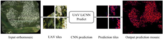 UAV LiCNN prediction script. A workflow diagram outlining the UAV LiCNN prediction script, where the input orthomosaics are broken up into tiles, passed through a trained neural network model. Then, the prediction tiles are stitched together to make an output mosaic.