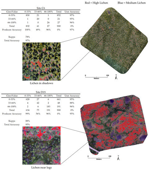 The manual point accuracy assessment showed that the UAV LiCNN effectively classified pixels, with an average total accuracy of 95.94%. Interrater reliability, an agreement measurement between the expected and observed accuracy, was calculated with an average kappa 80.79%, showing a strong level of agreement [34]. User accuracy, the probability that a predicted value is correct, and producer accuracy, the probability that a value in a class was correctly classified, were calculated for the three classes. The UAV LiCNN is accurate at classifying high lichen pixels, with an average producer and user accuracy of 92.93% and 85.84%, respectively (Table 2). Part of the reason for the lower user accuracy can be attributed to the misclassified logs and other ground covers which were not truly lichen. The medium lichen class had an average producer accuracy of 55.88% and a higher user accuracy of 86.04%. The primary reason for the lower producer error in this class can be attributed to the large portion of the low-class pixels truly being medium-class lichen. The low class had the highest average accuracy across all sites, with an average user and producer accuracy of 96.74% and 98.75%, respectively. Figure 6 displays the confusion matrices for Site C6 and Site D15, along with a close-up and map of the orthomosaic composite. Sites C6 and D15 were selected for Figure 6 because they had varying terrain, lighting, and different amounts of lichen. In addition, these orthomosaics highlighted issues with classifying lichen in shadows and lichen near logs.