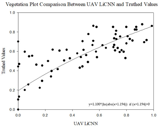 This accuracy assessment consisted of the 77 vegetation microplots which were visible in the UAV orthomosaics and had respective ground photographs. Vegetation microplots obstructed by trees in the UAV orthomosaic were excluded from this assessment. When comparing the validation data and the UAV LiCNN values, it seems as though the UAV LiCNN underpredicted the lichen in the vegetation microplots. Due to the shape of the data in the scatterplot and our perceived relationship between the values, we decided that a logarithmic regression would best fit the natural pattern in the data given. We achieved an R2 of 0.6910 using a two-parameter logarithmic regression. Figure 8 is a graphical comparison of average lichen percentage in the 77 vegetation microplot with the UAV LiCNN predicted values and the logarithmic regression.