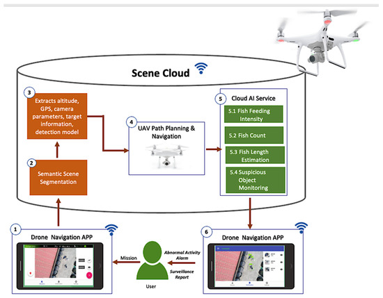 Once the target object is established, the autonomous drone uses the calculated path from the path planning to navigate to the target object and perform individual monitoring tasks (e.g., fish feeding intensity and suspicious object monitoring). The drone once again takes the video of the monitoring tasks and sends it to the scene cloud to execute the corresponding AI service. The AI services process the data and sends an alert for abnormal activity, suspicious events, or the level of the fish feeding. Instead of utilizing the drone to include graphics processing, the AI services, as part of the cloud, save a large amount of power consumed by graphics processing, enabling the drone to use its power to perform surveillance. The convolutional neural networks and other technical details for the semantic scene segmentation and cloud AI services are presented in Section 2.3.