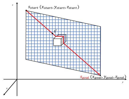 Since drone navigation is a dynamic planning problem due to its actual changing environments or characteristics, possible obstacles are present during the drone navigation process. The drone should be able to collect information and send it to the scene cloud to plan the path of an unfamiliar map in real-time. The D* Lite [11] algorithm for path planning works for a dynamic environment and is the most suitable for drone navigation. It uses the current position as the starting point for the calculation and searches backward from the target point to the starting point. In drone navigation using the D* Lite algorithm to navigate a three-dimensional space, for the space coordinates of the starting point , and target point , the axis and axis correspond to the GPS coordinates of longitude and latitude positions, respectively; the axis represents the drone’s navigational height. Figure 3 is a schematic diagram of drone navigation, and the blue grid is the drone flight map. This map is a plane composed of four points (), (), (), (). When encountering obstacles, the edge is updated, and the path is re-panned. Hence, if an obstacle (white box) suddenly appears during the navigation at the top, a new plan or path is created from the scene cloud and sends this information for the drone to avoid the obstacle until it reaches its target destination or path.