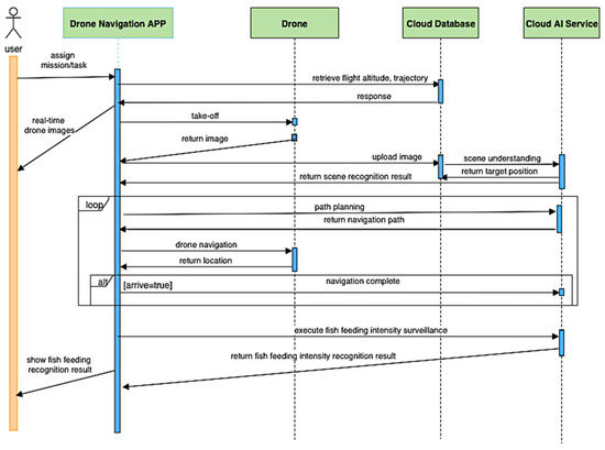 The sequence interaction diagram shows the order of interaction between the app, drone, cloud database, and the cloud services and how they work together to execute and complete visual surveillance. Figure 5 is the sequence diagram for the fish feeding intensity. Initially, the user selects the mission using the Drone Navigation App, which serves as the communication channel for the drone, cloud database, and cloud service for the drone take-off, capturing images and setting the route or path for the drone to navigate. The drone obtains the necessary parameters for navigation from the cloud database, the internal and external camera parameters, field knowledge for field analysis, path planning, and feeding monitoring.