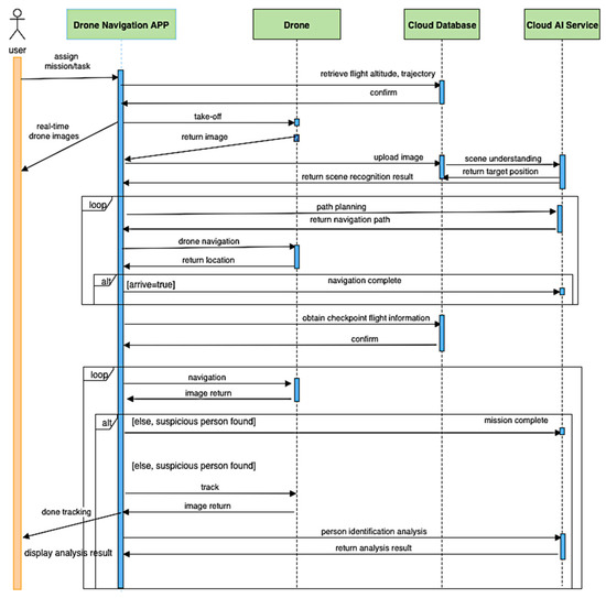 Figure 6 is the sequence diagram for monitoring the personnel in the aquaculture site. The same steps are integrated as for drone navigation in Figure 5. The only difference is that the personnel monitoring task is continuous even after obtaining the checkpoint. The drone monitors all individuals found on the site, one at a time. It captures the facial image of each person and sends it to the cloud AI service to perform face recognition. Once the cloud detects a suspicious person based on the facial images sent by the drone, the cloud alerts the user using the navigation app. If there is no suspicious person from the people present in the aquaculture site, the mission ends.