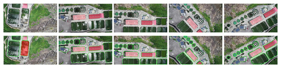 Aerial image of Gongliao Aquatic Experiment Center; the upper row is the original data; the bottom row is the labeled training data.