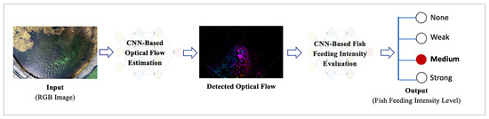 The fish feeding intensity is a part of the AI service which can evaluate the level of satiety of fish. As shown in Figure 8, we combined two deep neural network models: CNN-based optical flow estimation for motion estimation and CNN-based fish feeding-intensity evaluation to generate higher-accuracy results. For the optical flow estimation, we used video interpolation-based CNN [16] to estimate and generate the optical flow from our RGB input image sequences. The generated optical flow is used as input to the I3D model to determine the level of feeding intensity as none, weak, medium, or strong. The I3D model, as a two-stream approach, takes both the RGB video and the sequences of our preprocessed optical flow images [17] as inputs.